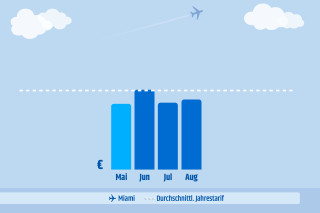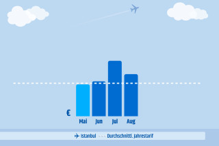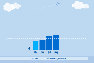 Die gepunktete weiße Linie ist die durchschnittliche Rate für die Route über das ganze Jahr. Die blauen Balken stellen den durchschnittlichen Ticketpreis in dem jeweiligen Monat dar.